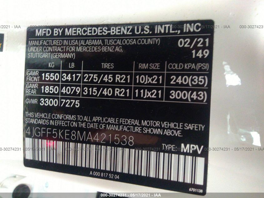 | VIN Number | 4JGFF5KE8MA421538 |