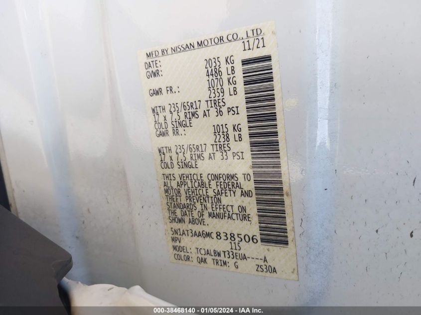 2021 NISSAN ROGUE – 5N1AT3AA6MC838506