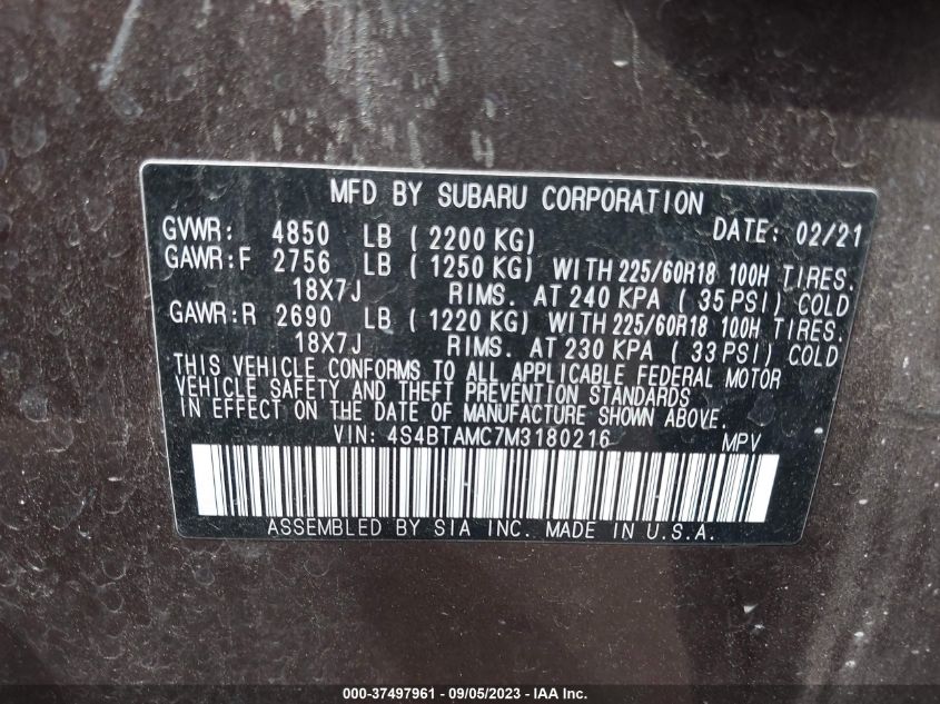This 2021 Subaru Outback (Brown) comes from a major insurance auction in the USA or Canada. All information on this page is linked to the vehicle’s VIN (4S4BTAMC7M3180216), which helps confirm where the car was listed and what condition it was in at the time of sale.