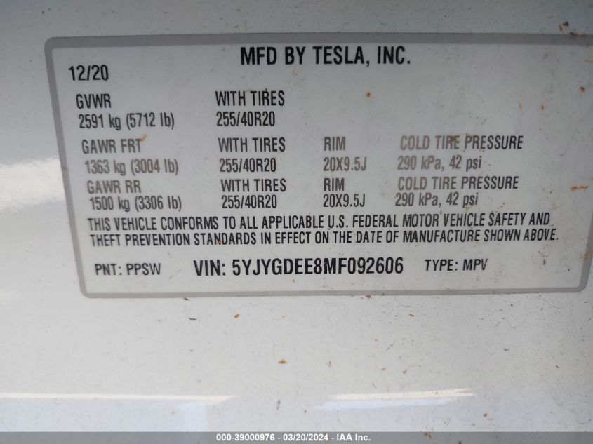 2021 TESLA MODEL Y – 5YJYGDEE8MF092606