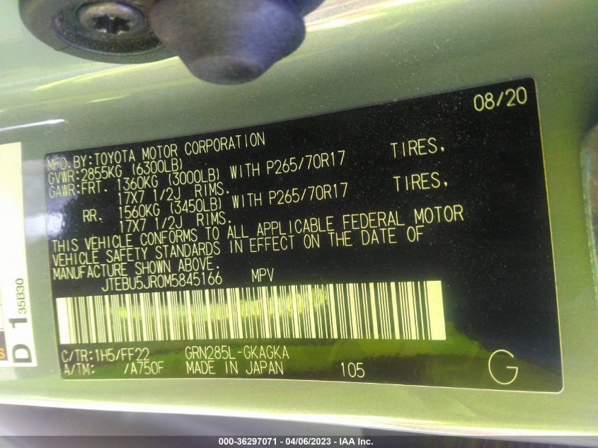 This 2021 Toyota 4Runner (Other) comes from a major insurance auction in the USA or Canada. All information on this page is linked to the vehicle’s VIN (JTEBU5JR0M5845166), which helps confirm where the car was listed and what condition it was in at the time of sale.