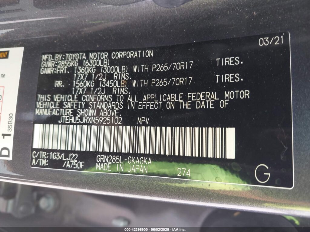 This 2021 Toyota 4Runner (Grey) comes from a major insurance auction in the USA or Canada. All information on this page is linked to the vehicle’s VIN (JTEHU5JRXM5925102), which helps confirm where the car was listed and what condition it was in at the time of sale.