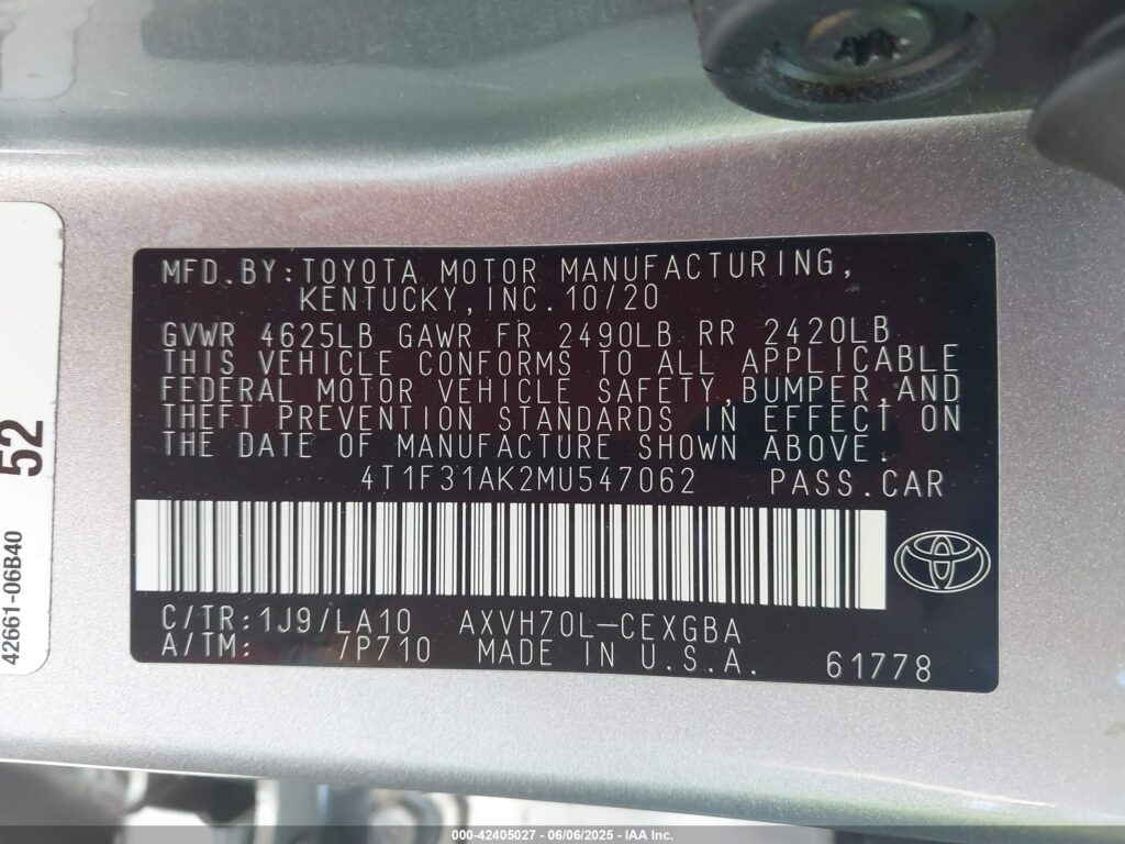 This 2021 Toyota Camry (Silver) comes from a major insurance auction in the USA or Canada. All information on this page is linked to the vehicle’s VIN (4T1F31AK2MU547062), which helps confirm where the car was listed and what condition it was in at the time of sale.