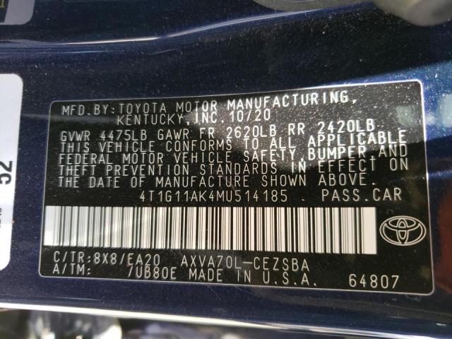 This 2021 Toyota Camry (Blue) comes from a major insurance auction in the USA or Canada. All information on this page is linked to the vehicle’s VIN (4T1G11AK4MU514185), which helps confirm where the car was listed and what condition it was in at the time of sale.