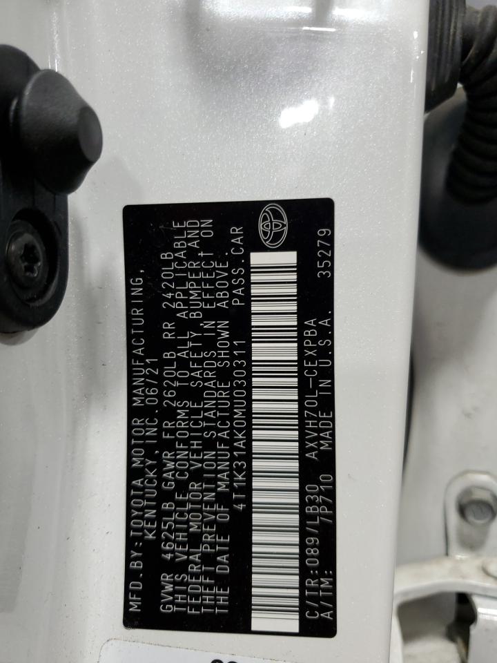 This 2021 TOYOTA CAMRY (WHITE) comes from a major insurance auction in the USA or Canada. All information on this page is linked to the vehicle’s VIN (4T1K31AK0MU030311), which helps confirm where the car was listed and what condition it was in at the time of sale.
