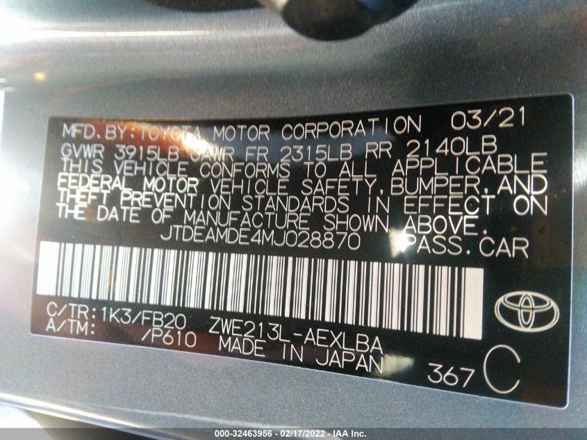 This 2021 Toyota Corolla (Other) comes from a major insurance auction in the USA or Canada. All information on this page is linked to the vehicle’s VIN (JTDEAMDE4MJ028870), which helps confirm where the car was listed and what condition it was in at the time of sale.