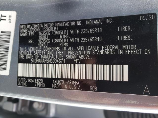 This 2021 Toyota Highlander (Blue) comes from a major insurance auction in the USA or Canada. All information on this page is linked to the vehicle’s VIN (5TDHARAH5MS004671), which helps confirm where the car was listed and what condition it was in at the time of sale.