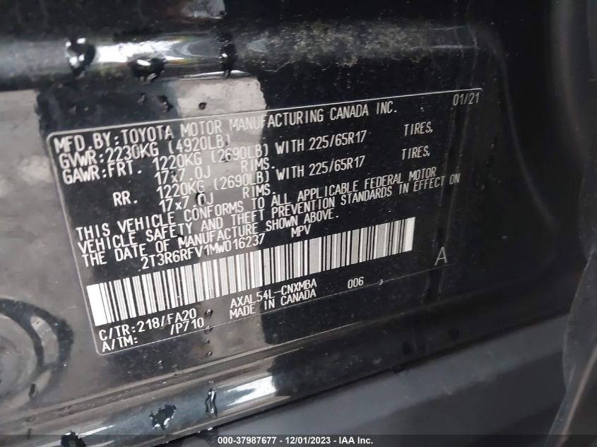 This 2021 Toyota RAV4 (Other) comes from a major insurance auction in the USA or Canada. All information on this page is linked to the vehicle’s VIN (2T3R6RFV1MW016237), which helps confirm where the car was listed and what condition it was in at the time of sale.