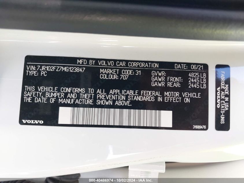 This 2021 VOLVO S60 (Unknown Color) comes from a major insurance auction in the USA or Canada. All information on this page is linked to the vehicle’s VIN (7JR102FZ7MG123847), which helps confirm where the car was listed and what condition it was in at the time of sale.