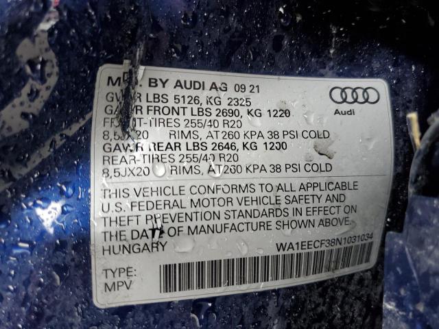 This 2022 Audi Q3 (Blue) comes from a major insurance auction in the USA or Canada. All information on this page is linked to the vehicle’s VIN (WA1EECF38N1031034), which helps confirm where the car was listed and what condition it was in at the time of sale.