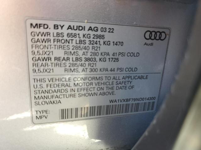 This 2022 Audi Q7 (Silver) comes from a major insurance auction in the USA or Canada. All information on this page is linked to the vehicle’s VIN (WA1VXBF79ND014300), which helps confirm where the car was listed and what condition it was in at the time of sale.