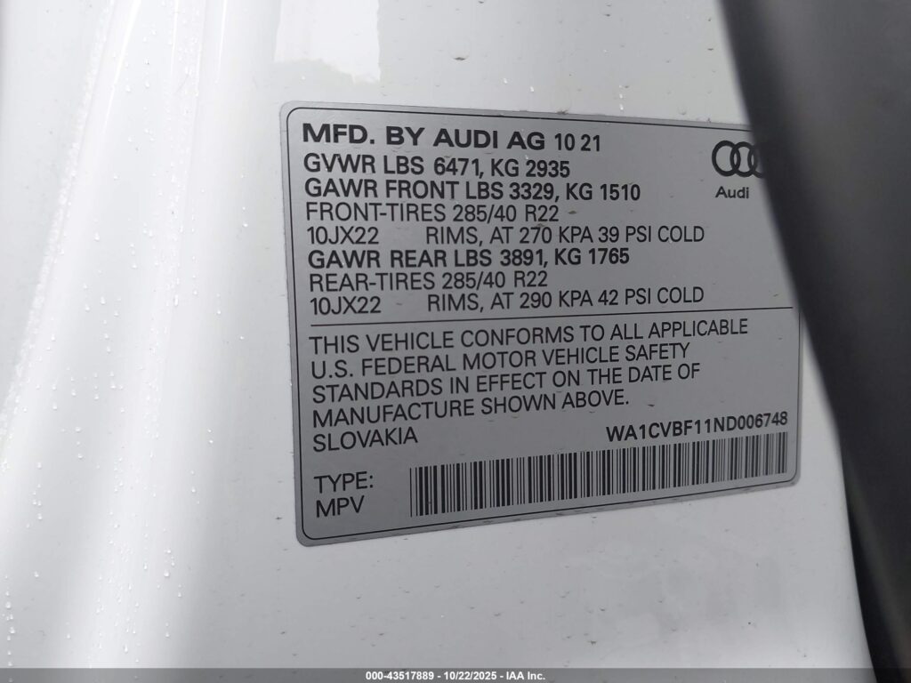 This 2022 Audi Q8 (White) comes from a major insurance auction in the USA or Canada. All information on this page is linked to the vehicle’s VIN (WA1CVBF11ND006748), which helps confirm where the car was listed and what condition it was in at the time of sale.
