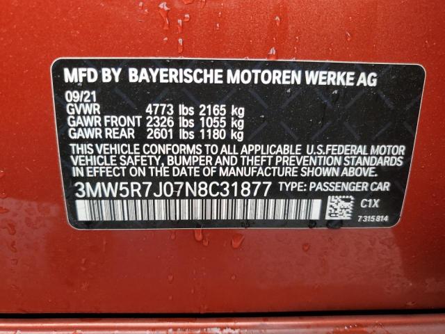 This 2022 BMW 3 Series (Orange) comes from a major insurance auction in the USA or Canada. All information on this page is linked to the vehicle’s VIN (3MW5R7J07N8C31877), which helps confirm where the car was listed and what condition it was in at the time of sale.