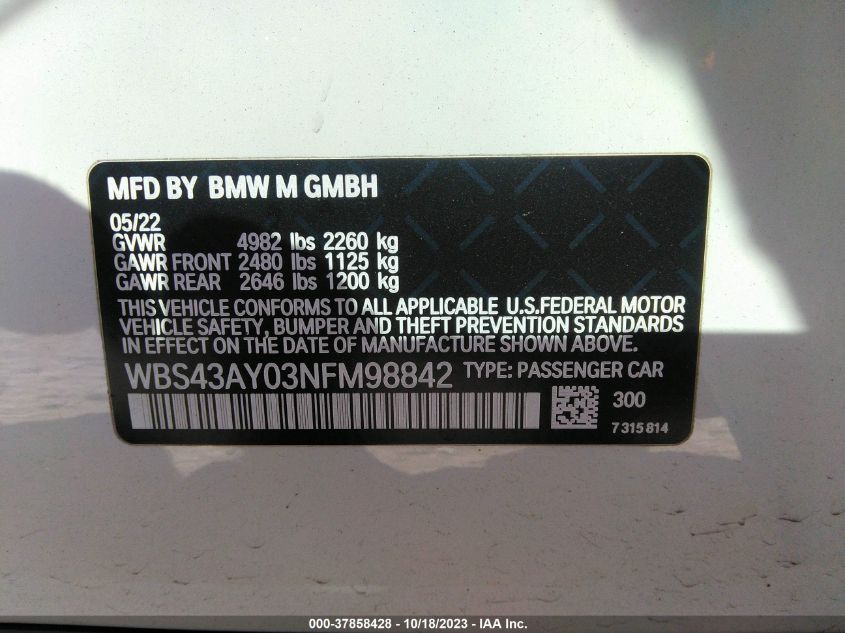 This 2022 BMW M3 (Other) comes from a major insurance auction in the USA or Canada. All information on this page is linked to the vehicle’s VIN (WBS43AY03NFM98842), which helps confirm where the car was listed and what condition it was in at the time of sale.