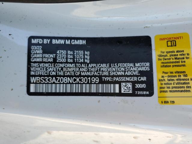 This 2022 BMW M4 (White) comes from a major insurance auction in the USA or Canada. All information on this page is linked to the vehicle’s VIN (WBS33AZ08NCK30199), which helps confirm where the car was listed and what condition it was in at the time of sale.