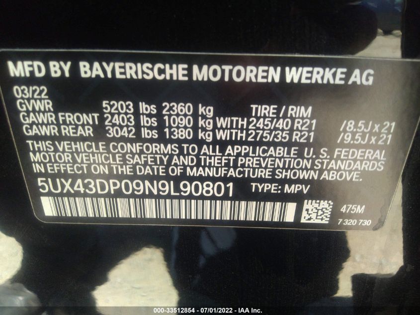 This 2022 BMW X3 (Black) comes from a major insurance auction in the USA or Canada. All information on this page is linked to the vehicle’s VIN (5UX43DP09N9L90801), which helps confirm where the car was listed and what condition it was in at the time of sale.