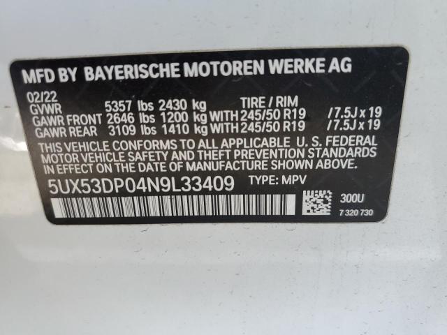This 2022 BMW X3 (White) comes from a major insurance auction in the USA or Canada. All information on this page is linked to the vehicle’s VIN (5UX53DP04N9L33409), which helps confirm where the car was listed and what condition it was in at the time of sale.