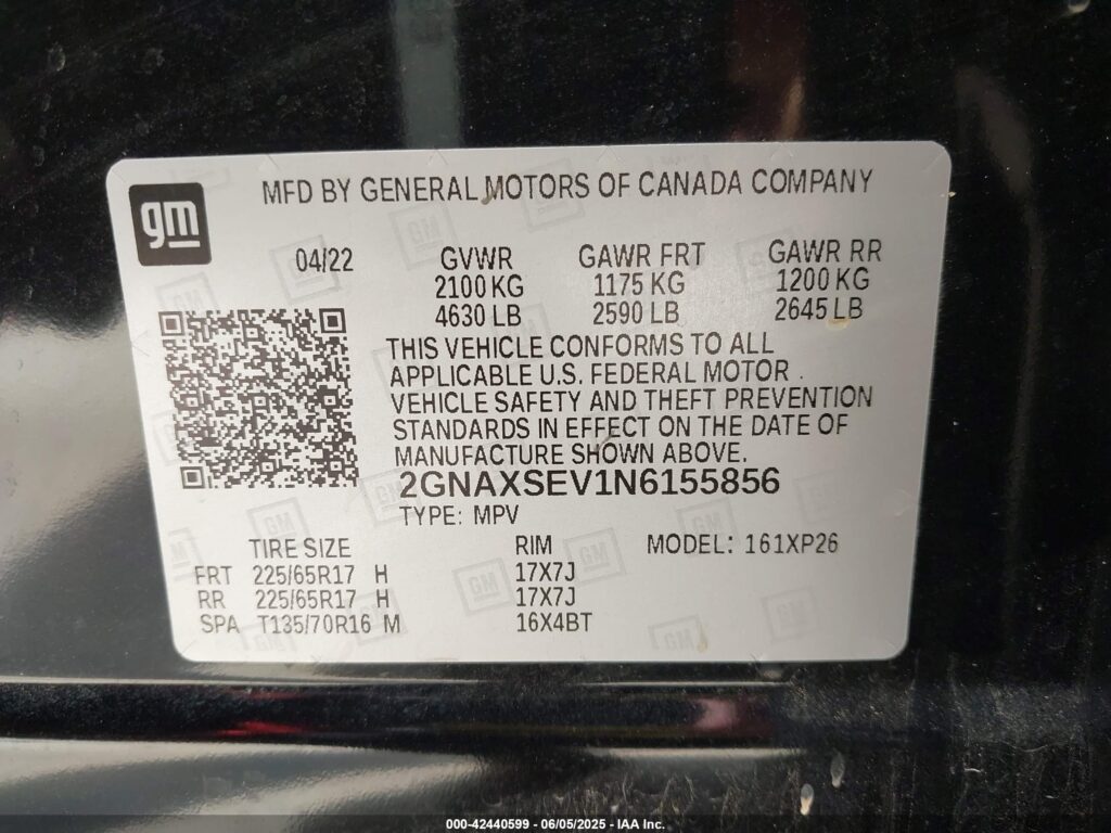 This 2022 Chevrolet Equinox (Black) comes from a major insurance auction in the USA or Canada. All information on this page is linked to the vehicle’s VIN (2GNAXSEV1N6155856), which helps confirm where the car was listed and what condition it was in at the time of sale.