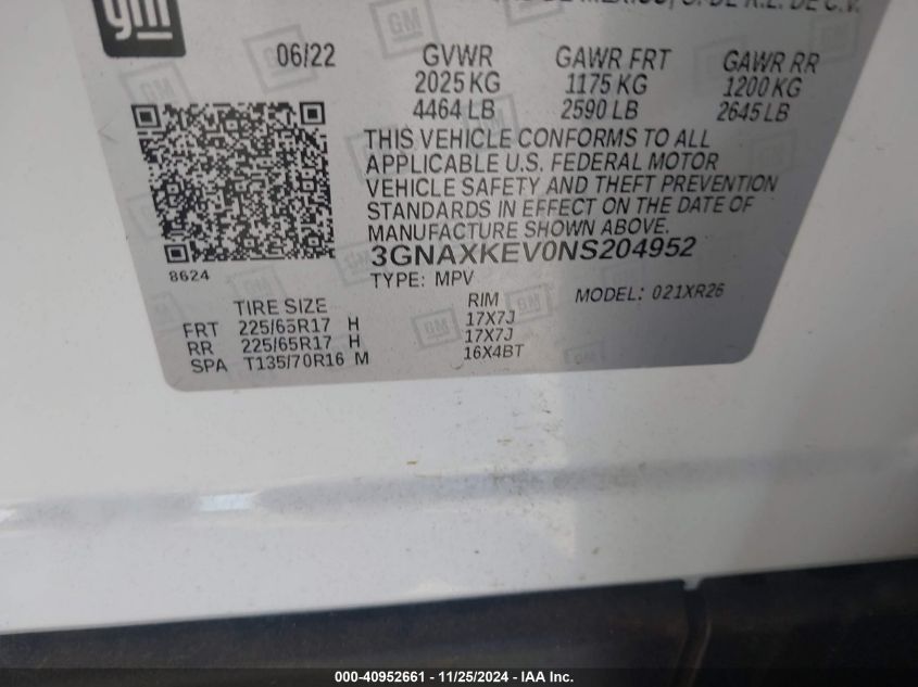 This 2022 CHEVROLET EQUINOX (White) comes from a major insurance auction in the USA or Canada. All information on this page is linked to the vehicle’s VIN (3GNAXKEV0NS204952), which helps confirm where the car was listed and what condition it was in at the time of sale.