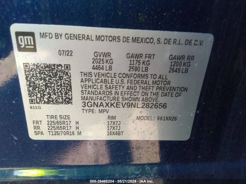 This 2022 CHEVROLET EQUINOX (Blue) comes from a major insurance auction in the USA or Canada. All information on this page is linked to the vehicle’s VIN (3GNAXKEV9NL282656), which helps confirm where the car was listed and what condition it was in at the time of sale.