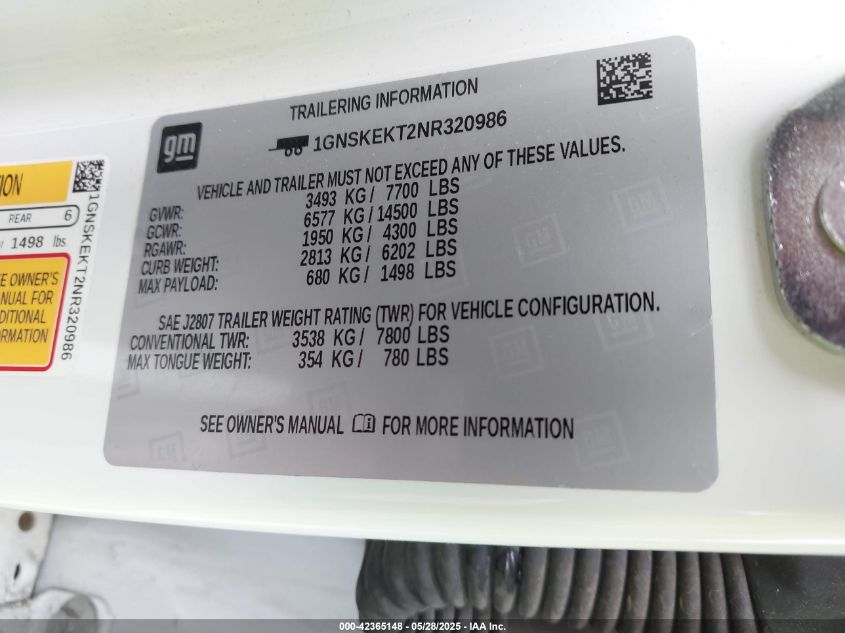 This 2022 CHEVROLET SUBURBAN (White) comes from a major insurance auction in the USA or Canada. All information on this page is linked to the vehicle’s VIN (1GNSKEKT2NR320986), which helps confirm where the car was listed and what condition it was in at the time of sale.