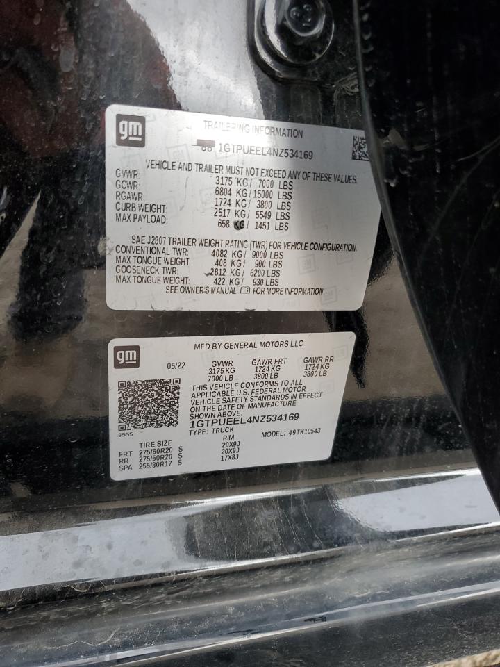 This 2022 GMC Sierra (Black) comes from a major insurance auction in the USA or Canada. All information on this page is linked to the vehicle’s VIN (1GTPUEEL4NZ534169), which helps confirm where the car was listed and what condition it was in at the time of sale.
