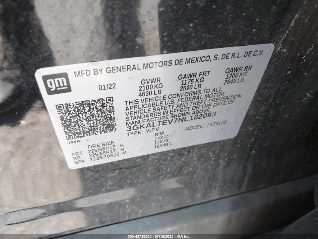 This 2022 GMC Terrain (Black) comes from a major insurance auction in the USA or Canada. All information on this page is linked to the vehicle’s VIN (3GKALTEV7NL162093), which helps confirm where the car was listed and what condition it was in at the time of sale.
