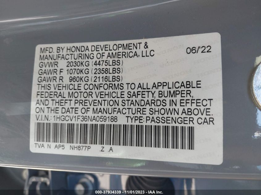 This 2022 Honda Accord (Grey) comes from a major insurance auction in the USA or Canada. All information on this page is linked to the vehicle’s VIN (1HGCV1F36NA059188), which helps confirm where the car was listed and what condition it was in at the time of sale.