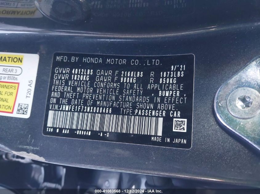 2022 HONDA CIVIC – JHMFE1F73NX008466