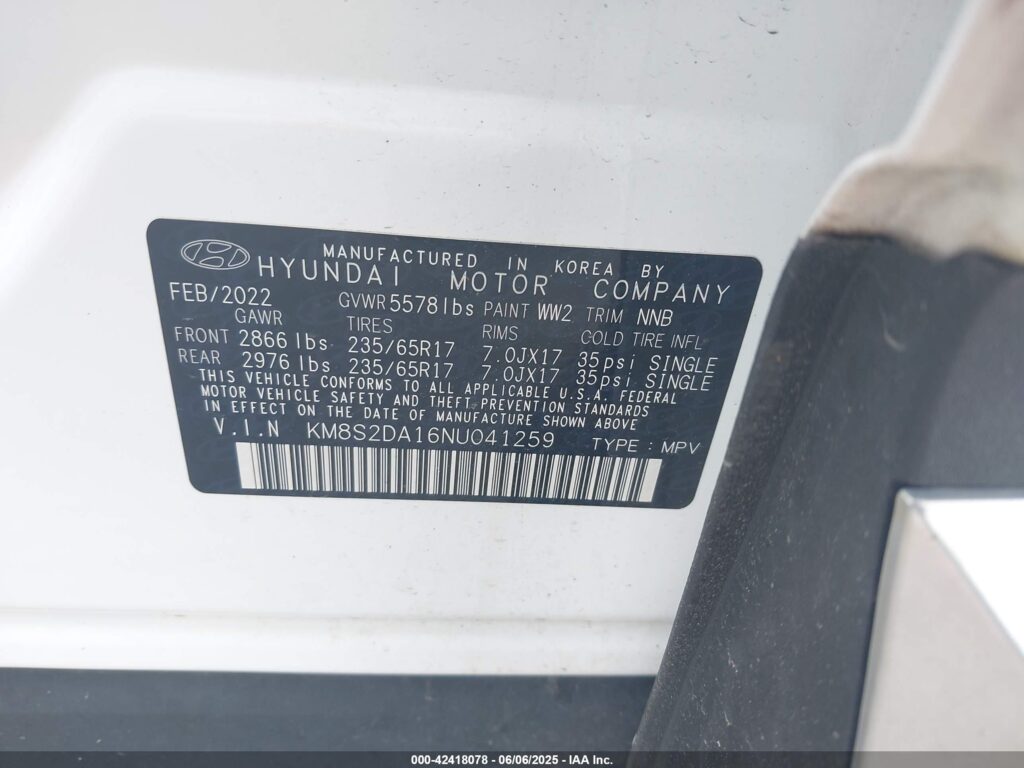 This 2022 Hyundai Santa Fe Hybrid (White) comes from a major insurance auction in the USA or Canada. All information on this page is linked to the vehicle’s VIN (KM8S2DA16NU041259), which helps confirm where the car was listed and what condition it was in at the time of sale.