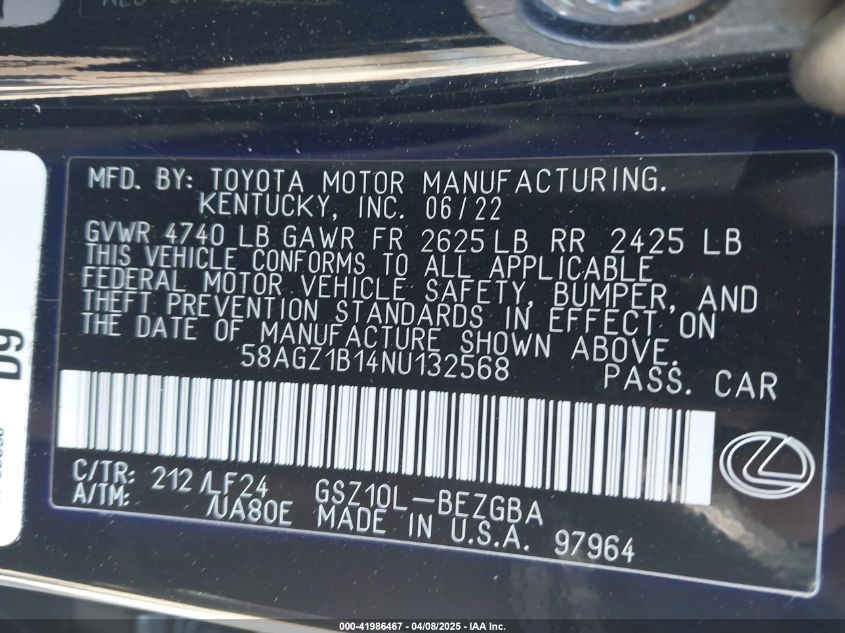 2022 LEXUS ES 350 – 58AGZ1B14NU132568