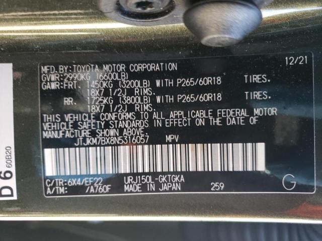 This 2022 Lexus GX (Green) comes from a major insurance auction in the USA or Canada. All information on this page is linked to the vehicle’s VIN (JTJKM7BX8N5316057), which helps confirm where the car was listed and what condition it was in at the time of sale.