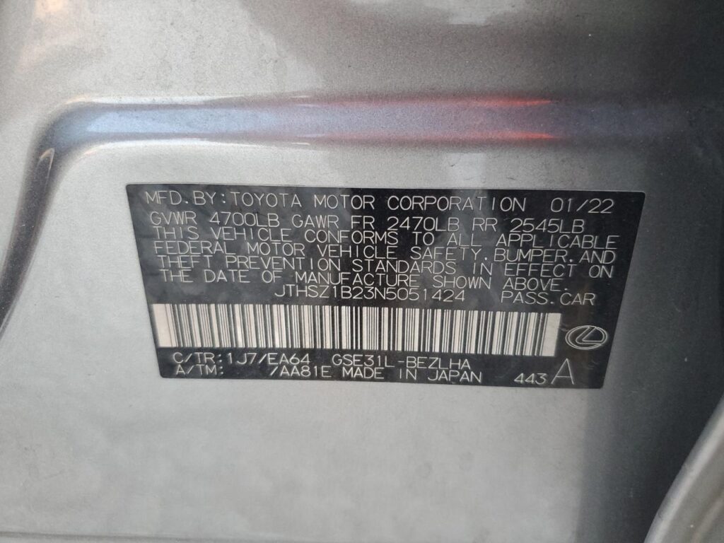 This 2022 LEXUS IS 350 F S (SILVER) comes from a major insurance auction in the USA or Canada. All information on this page is linked to the vehicle’s VIN (JTHSZ1B23N5051424), which helps confirm where the car was listed and what condition it was in at the time of sale.