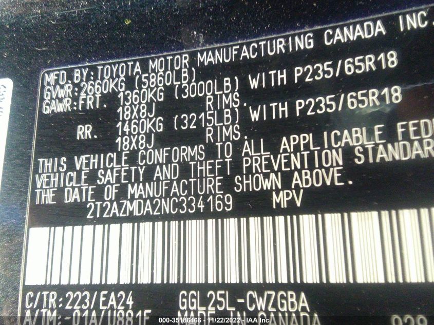 This 2022 Lexus RX (Black) comes from a major insurance auction in the USA or Canada. All information on this page is linked to the vehicle’s VIN (2T2AZMDA2NC334169), which helps confirm where the car was listed and what condition it was in at the time of sale.