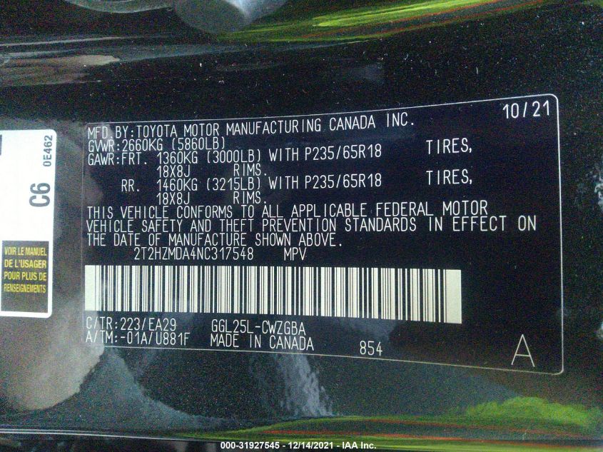 This 2022 Lexus RX 350 (Black) comes from a major insurance auction in the USA or Canada. All information on this page is linked to the vehicle’s VIN (2T2HZMDA4NC317548), which helps confirm where the car was listed and what condition it was in at the time of sale.