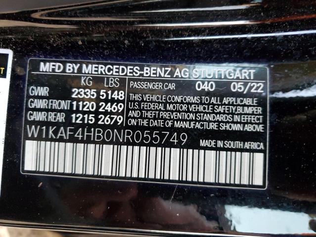 This 2022 Mercedes-Benz C-Class (Black) comes from a major insurance auction in the USA or Canada. All information on this page is linked to the vehicle’s VIN (W1KAF4HB0NR055749), which helps confirm where the car was listed and what condition it was in at the time of sale.