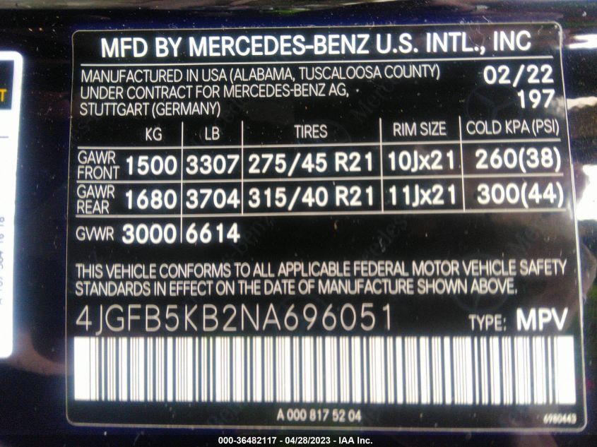 | VIN Number | 4JGFB5KB2NA696051 |