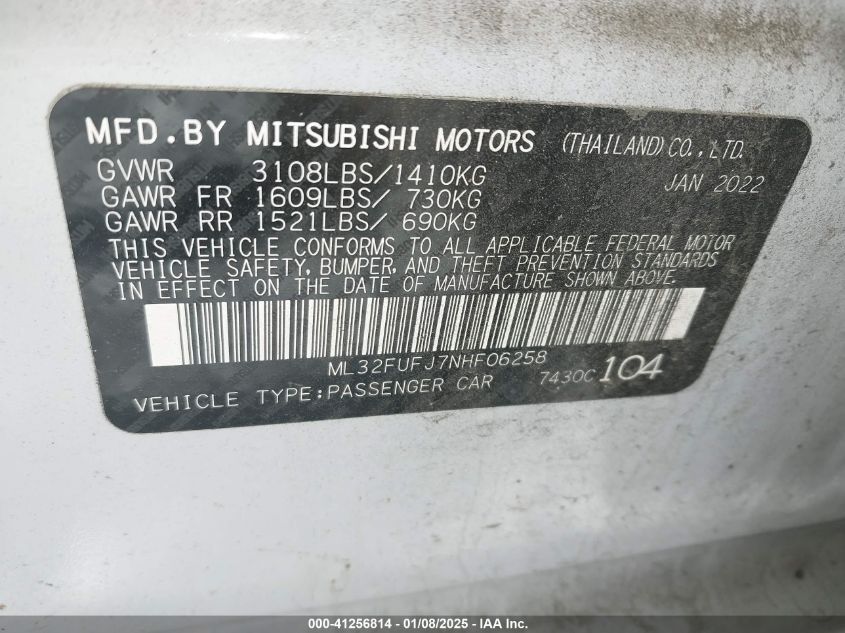 This 2022 MITSUBISHI MIRAGE G4 (White) comes from a major insurance auction in the USA or Canada. All information on this page is linked to the vehicle’s VIN (ML32FUFJ7NHF06258), which helps confirm where the car was listed and what condition it was in at the time of sale.