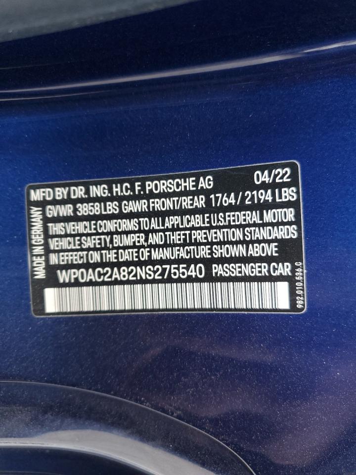 | VIN Number | WP0AC2A82NS275540 |