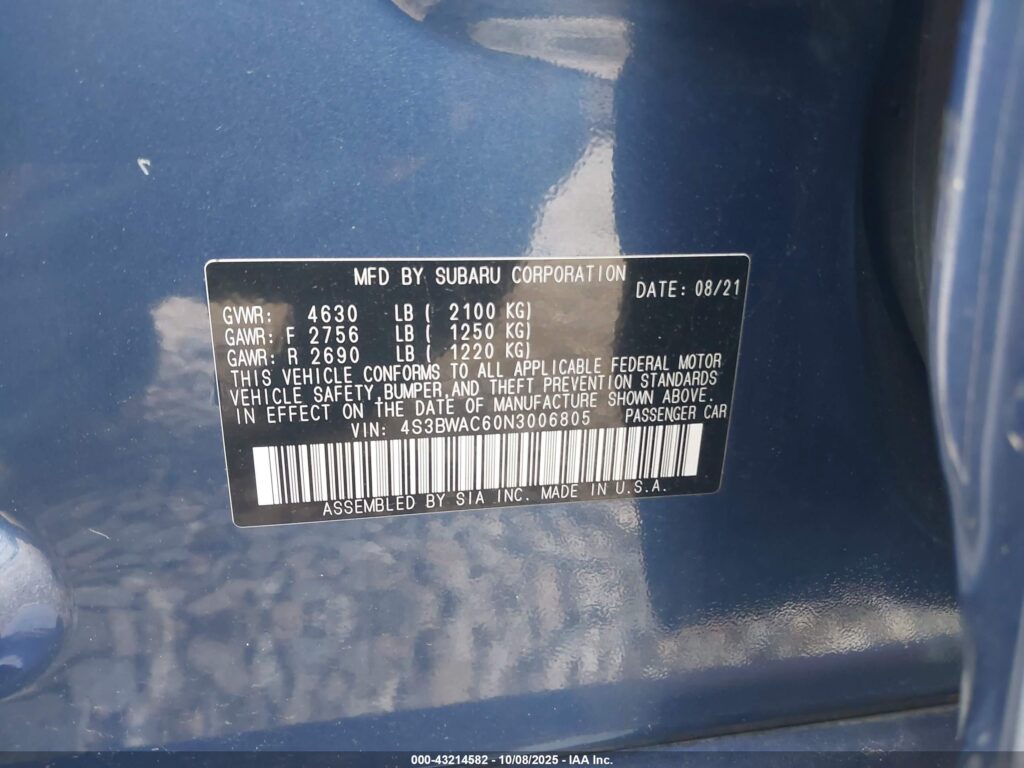 This 2022 Subaru Legacy (Blue) comes from a major insurance auction in the USA or Canada. All information on this page is linked to the vehicle’s VIN (4S3BWAC60N3006805), which helps confirm where the car was listed and what condition it was in at the time of sale.