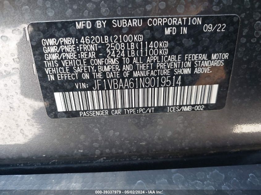 2022 SUBARU WRX – JF1VBAA61N9019514