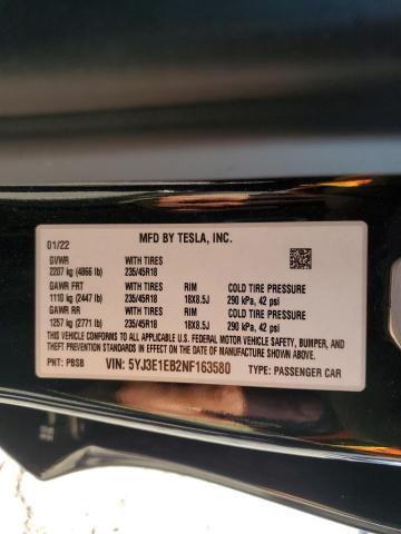 This 2022 TESLA MODEL 3 (BLACK) comes from a major insurance auction in the USA or Canada. All information on this page is linked to the vehicle’s VIN (5YJ3E1EB2NF163580), which helps confirm where the car was listed and what condition it was in at the time of sale.