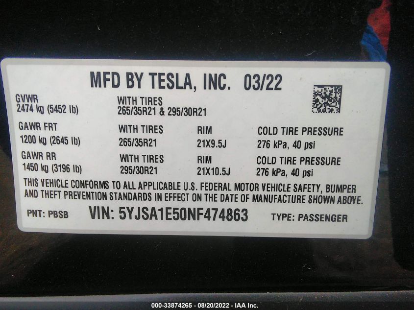 This 2022 Tesla Model S (Black) comes from a major insurance auction in the USA or Canada. All information on this page is linked to the vehicle’s VIN (5YJSA1E50NF474863), which helps confirm where the car was listed and what condition it was in at the time of sale.