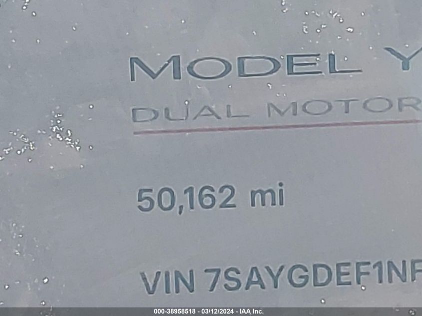 2022 TESLA MODEL Y – 7SAYGDEF1NF441845