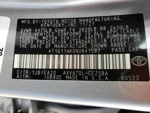 This 2022 Toyota Camry (Silver) comes from a major insurance auction in the USA or Canada. All information on this page is linked to the vehicle’s VIN (4T1G11AK0NU641582), which helps confirm where the car was listed and what condition it was in at the time of sale.
