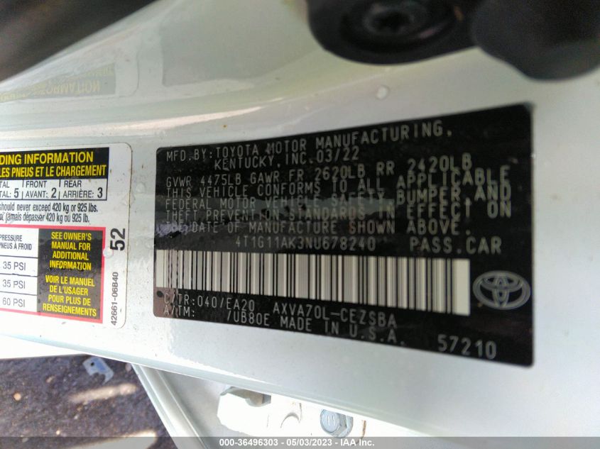 This 2022 Toyota Camry (Other) comes from a major insurance auction in the USA or Canada. All information on this page is linked to the vehicle’s VIN (4T1G11AK3NU678240), which helps confirm where the car was listed and what condition it was in at the time of sale.