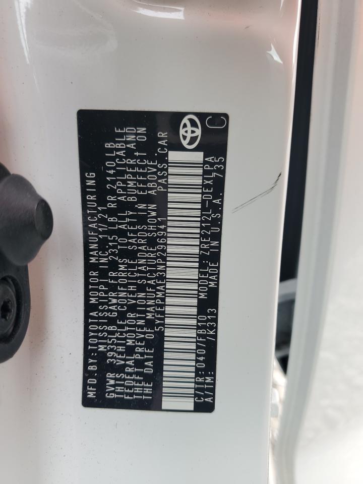 This 2022 TOYOTA COROLLA (WHITE) comes from a major insurance auction in the USA or Canada. All information on this page is linked to the vehicle’s VIN (5YFEPMAE3NP296941), which helps confirm where the car was listed and what condition it was in at the time of sale.