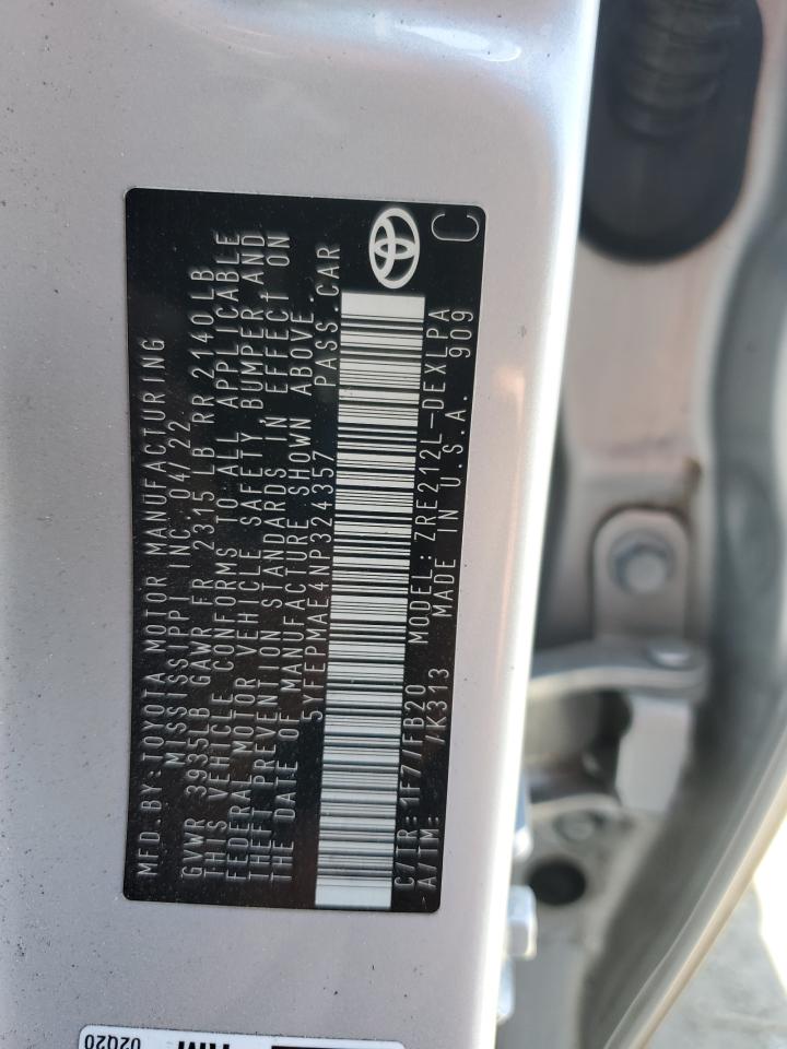 This 2022 Toyota Corolla (Silver) comes from a major insurance auction in the USA or Canada. All information on this page is linked to the vehicle’s VIN (5YFEPMAE4NP324357), which helps confirm where the car was listed and what condition it was in at the time of sale.