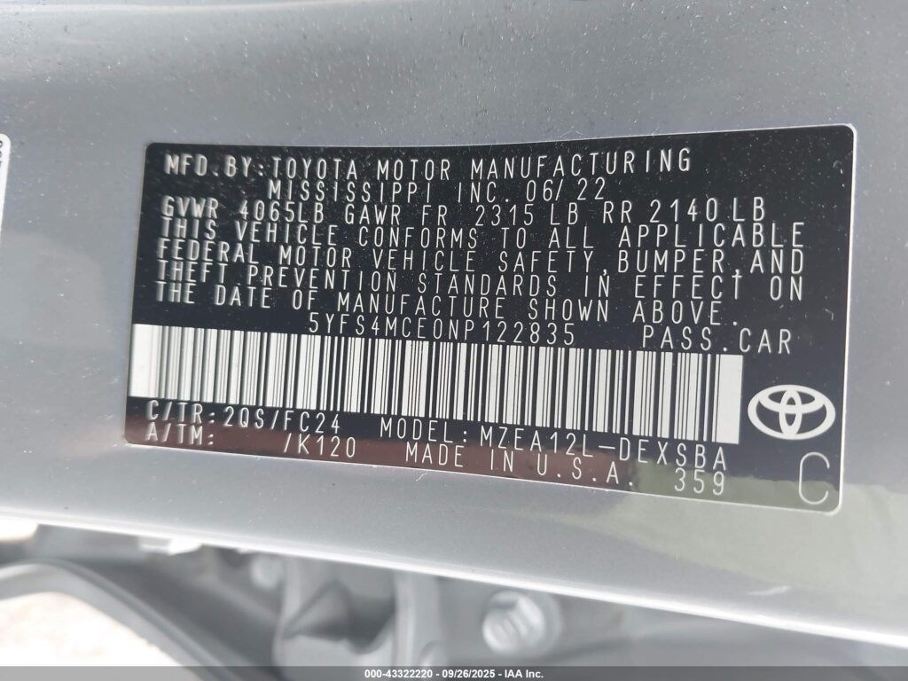 2022 Toyota Corolla – 5YFS4MCE0NP122835