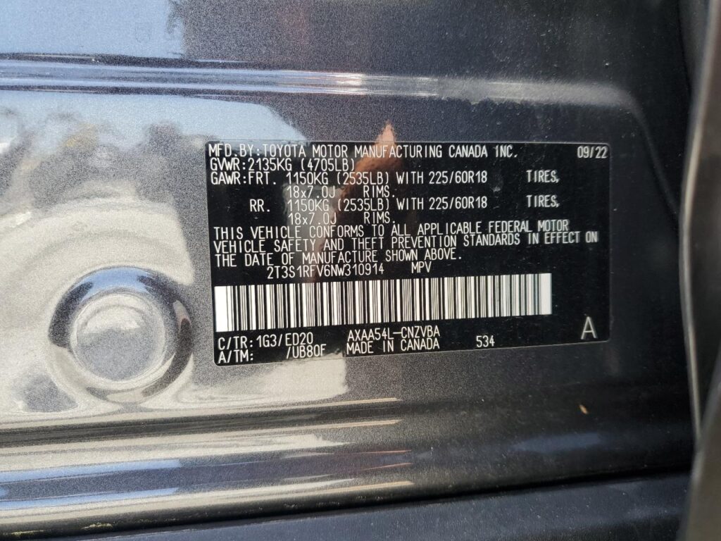 VIN: 2T3S1RFV6NW310914